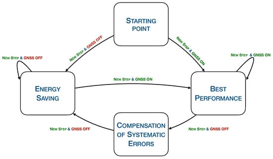Thus, the designed structure of the filter can be seen as a state machine that evolves every time a new step is detected and has a different behavior depending on the presence or not of the satellite data. Furthermore, between one restart and the subsequent one of the GNSS, it is possible to implement a compensation strategy of the systematic errors that are committed on the determination of the estimate of the step length and the heading angle [17]. Figure 8 shows a block diagram of the operating principle of the described filter.