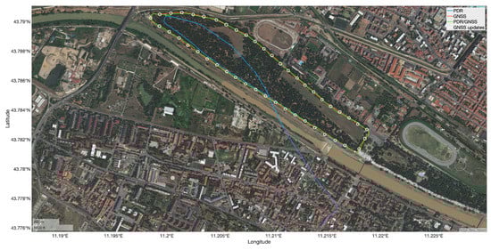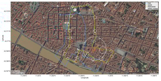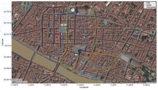 Figure 9 shows the results for this case. It is possible to notice how the path that is reconstructed only from the inertial data (blue line) deviates from the others due to the accumulation of errors, as foreseen by the PDR method. The position results related to GNSS data, on the other hand, is strongly influenced by the accuracy with which the position solutions are determined and being an urban route it is not always sufficiently high.