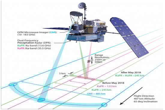 The Global Precipitation Mission satellite was launched on 27 February, 2014 into a 65° inclination, 407 km altitude, non-sun-synchronous orbit. This is a joint Earth Observation Science mission by the National Aeronautics and Space Administration (NASA) and the Japan Aerospace Exploration Agency (JAXA), which extends the TRMM time series [,] and enhances the measurement of global precipitation [,]. The satellite carries two microwave remote sensors, namely, a passive GPM microwave imager (GMI) and a dual-frequency precipitation radar (DPR).