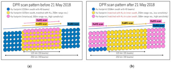 Scan pattern of GPM DPR: (a) before 21 May, 2018 and (b) after 21 May, 2018. Blue circles indicate Ku-band precipitation radar (KuPR) footprints, while yellow and pink circles represent a matched (KaMS), and highly sensitive (KaHS) swath of Ka, respectively [].