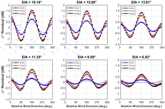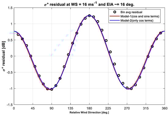 Historically, the radar ocean backscatter GMF has been modeled as a cosine Fourier series [,], but our initial analysis used both sine and cosine terms in Equation (1). However, after a comprehensive investigation, it was concluded that the sine terms were not statistically significant, and as a result, they were neglected. Figure 3 illustrates a typical comparison of the GMF, with and without the sine terms, for an EIA = 16 and WS of 16 m/s. The circle symbols are the residual [] of empirical bin average , and the red solid line is the full model (Equation (1), sines and cosines) and the blue solid line is the cosine alone GMF. As shown, the contribution of the odd terms is negligible and the azimuth anisotropy can be well approximated by only even terms.