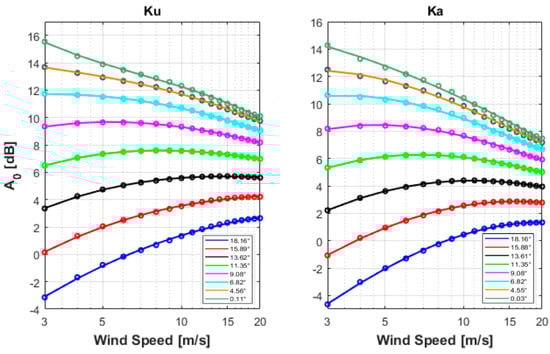 Isotropic σ0 models ( coefficients in dB) of KuPR (left) and Ka-band precipitation (KaPR) (right) as a function of wind speed (3–20 ms−1) at different earth incidence angles (0 –18.1). The symbols are mean values of binned σ0 measurements while the solid lines represent their 3rd order regression fits.