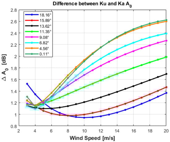 Difference between isotropic σ0 models (in dB) of KuPR and KaPR as a function of wind speed (3–20 ms−1) at different earth incidence angles (0°–18.1°).