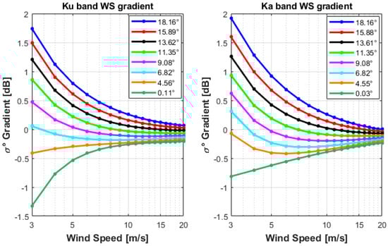 Gradient of KuPR (left) and KaPR (right) ocean surface normalized radar cross section (σ0) variation (in dB) as a function of wind speed (3–20 ms−1) at different earth incidence angles (0°–18.1°).