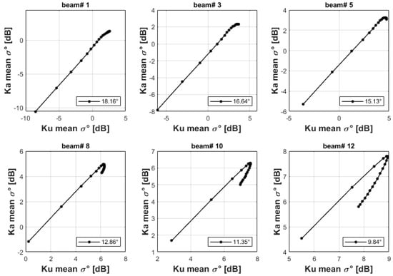 Scatter plot of KaPR mean σ0 with KuPR mean σ0 (in dB) for wind speed (WS) = 1–20 ms−1 at different angular beam positions.