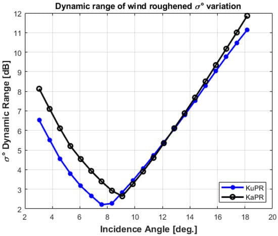 Dynamic range of wind roughened σ0 (in dB) for Ku and KaPR for WS = 1–20 ms−1.