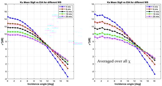 Mean value of binned σ0 (in dB) at KuPR (left) and KaPR (right) as a function of earth incidence angle θ, for different wind speeds.