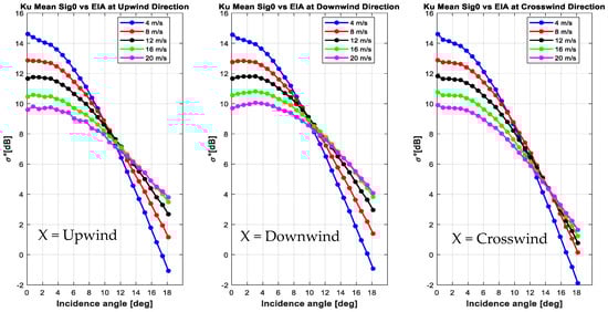 Finally, the mean values of binned average σ0 for Ku and Ka bands are shown in Figure 9 as a function of EIA for different wind speeds. The σ0 monotonically decreases with increasing incidence angle from nadir to 18.2°. Additionally, the σ0 decreases monotonically with wind speed at EIAs near nadir, but σ0 increases monotonically with wind speed near EIA 18.2°, with a transition in the middle where σ0 becomes relatively insensitive to WS (for WS ms−1). For KuPR, this transition occurs over EIA 11°–13, whereas for KaPR it occurs over EIA 12°–14°. Additionally, these transition regions vary with the relative azimuth look, for upwind/downwind/crosswind directions, as shown for KuPR in Figure 10 (these variations are proportionately similar at Ka-band which is not shown here). This EIA range of reduced σ0 variability is useful for the radar inter-calibration between these kinds of instruments []. Therefore, based upon these results, we conclude that the two GMF’s are similar and are applicable for a WS range of 3–20 ms−1 and for all EIA beam positions.