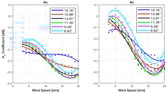 To analyze the directional anisotropy of both KuPR and KaPR, in accordance with Equation (5), the σ0 measurements in WS bins (±1 m/s) were further sorted into 10 relative wind direction (χ) bins. Afterwards, the Fourier series approximation of Equation (2) was applied to the bin average of both Ku and Ka PR (in dB space), to derive and coefficients for each WS and EIA bin position. Finally, and Fourier coefficients, thus derived, were modeled as a function of WS using third and seventh order polynomial regressions (in dB space), respectively. Unlike the case of in Equation (4), use of log (WS) for and does not reduce the order of the polynomials, thus WS measurements in linear units were used in these cases.