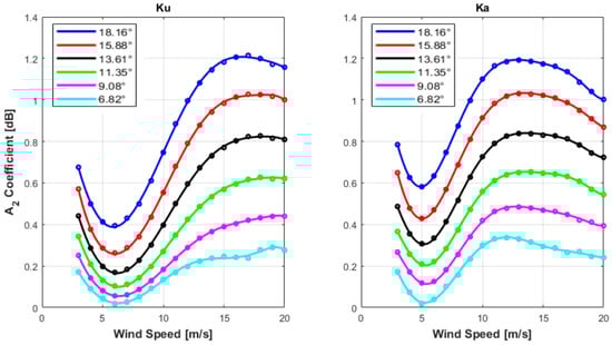 The and coefficients, for the corresponding EIA beam positions, are shown as a function of WS in Figure 11 and Figure 12, respectively. Symbols in both Figures represent the Fourier coefficients found from Equation (2), and the solid lines represent the corresponding polynomial fits (Equations (6) and (7)). For both bands, is negative, and the magnitude becomes more negative with increasing WS. Additionally, for the same EIA, the magnitude of the Ka band is slightly more negative, and the doubling of this coefficient is the measure of upwind-down wind asymmetry. For the coefficient, both bands have similar patterns, which decrease with increasing WS and reach a minimum (at ~6 m/s (Ku) and ~5 m/s (Ka)). Afterwards, the magnitude of rapidly increases with WS until it approximately saturates at WS ~= 14 m/s for Ku band and WS ~= 12 m/s for Ka band. The coefficient is a measure of upwind–crosswind asymmetry or total directional anisotropy, and it increases with EIA.