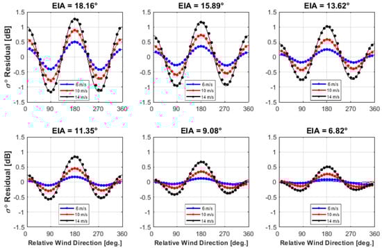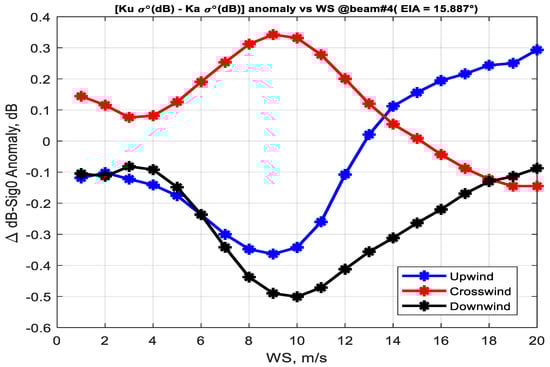 The relative difference between the Ku and Ka band σ0 directional residual (), is given in Figure 15 as a function of relative wind direction for the WS averaged over 6–14 m/s at different EIAs. As shown, the maximum difference occurs at the upwind, downwind and crosswind directions which is also a function of the EIA. Now consider the delta-σ0 residual, calculated at upwind, downwind and crosswind for an EIA ~ 16°, as a function of WS (given in Figure 16). At the downwind direction, the KaPR has a higher wind direction signal than KuPR for all WS, whereas for the upwind and crosswind, the polarity of the difference depends on WS range.