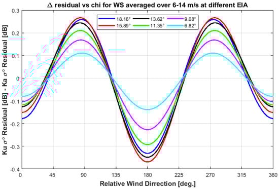 Delta residual (in dB) between KuPR and KaPR σ0 directional anisotropy as a function of relative wind direction (χ) at different EIAs, for wind speed averaged over 6–14 m/s.