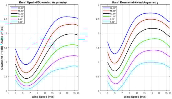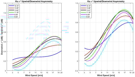 One of the interesting features of the σ0 WD anisotropy at low EIA is that it has an opposite upwind/downwind asymmetry compared to the conventional scatterometers that operate at moderate incidence angles (20°–70°). As shown in Figure 13 and Figure 14, DPR measures a higher σ0 from the downwind direction than that from the upwind direction, and 2 is the measure of the peak-to-peak upwind/downwind asymmetry. The differences between downwind and upwind σ0 measurements, separately for both KuPR and KaPR as a function of WS: 3–20 m/s, are shown in Figure 17 for six different EIAs: 6.8°–18.2°, and it is noted that for all EIAs, the measured σ0 asymmetry increases with WS of 6–16 m/s. Chu et al. (2012) [] also presented similar results for TRMM KuPR and Mouche et al. (2006) [] reported the same trends of asymmetries for a C band radar at low incidence angle. However, this paper presents new information concerning a higher upwind/downwind asymmetry for Ka band compared to the Ku band. For example, at EIA ~ 12°, the Ku band asymmetry is about 0.7 dB for a WS of 16 m/s, while it is > 1 dB for Ka band for the same EIA and WS.