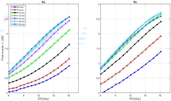 For scatterometers operating at moderate EIAs, the coefficient in Equations (2) and (5), usually defines the peak-to-peak (upwind to crosswind) anisotropy of σ0. However, for this low EIA range, since is negative and not negligible, backscatter response at the downwind direction is the sum of and . Therefore, the peak-to-peak anisotropy for this EIA range is defined downwind to crosswind which is > 2. Figure 18 shows the peak-to-peak σ0 anisotropy for Ku and Ka bands, as a function of WS for different EIAs. Additionally, Figure 19 shows the same results as a function of EIA for WS: 6–18 m/s. As previously discussed, the shape of this curve follows that of the A2 coefficient for both WS and EIA.