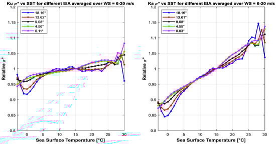 Relative sea surface temperature (SST) dependence of KuPR (left) and KaPR (right) σ0 at different EIAs over averaged WS.