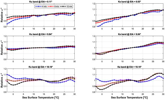 Next, these SST binned normalized σ0 data were sorted and averaged (separately for Ku and Ka) over WS values of 4, 8 and 12 m/s ranges, and the results are presented in Figure 21 for EIAs of 0.1°, 9.8° and 18.6°. Here, the results are similar to Figure 20 (averaged over all WS); however, there is also a slight WS dependence as noted by the separation of the curves. This is especially notable at the higher EIA that we suspect may be attributed to the WD effects presented next.