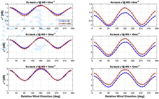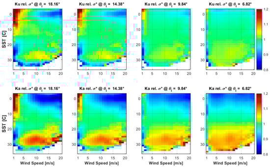 In previous research [], it was concluded that the SST has a small but significant effect on the observed ocean σ0 at Ku band; but in this paper, these SST effects were not explicitly identified in the development of the three dimensional (3D) GMF = f(WS, WD, EIA) Ku- and Ka-bands. Unfortunately, the available σ0 match-up datasets have insufficient observations for the development of a 4D GMF = f(WS, WD, SST, EIA); however, a somewhat qualitative assessment of the impact of SST on in the GMFs are presented below.