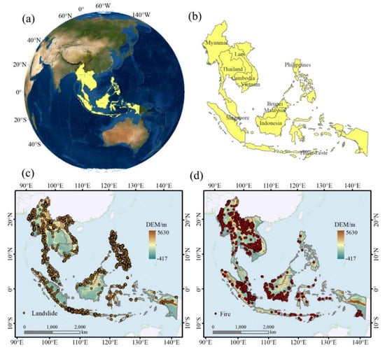 The location of the study area and the distribution of (c) landslide and (d) wildfire points. (a) The location of Southeast Asia on the globe. (b) Sovereign states in Southeast Asia.
