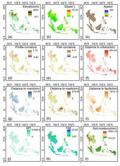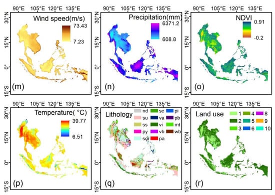 Conditioning factors are crucial for hazard susceptibility modeling and mapping. The factors were selected considering the characteristics of SEA, and data availability referring to the information collected from the literature [8,17,25,26,72]. In this paper, 18 conditioning factors in total were chosen for the hazard susceptibility assessment—namely, elevation, slope, aspect, plan curvature, profile curvature, TWI (Topographic Wetness Index), SPI (Stream Power Index), NDVI (Normalized Difference Vegetation Index), annual mean precipitation, annual mean maximum temperature, soil moisture, wind speed, lithology, land use, distance to roads, distance to rivers, distance to faults and distance to urban areas (Figure 2). The temperature, precipitation, windspeed and NDVI factors are the annual mean values. The separate conditioning factors used for landslides and wildfires are listed in Table 2. A database containing 18 factors and hazard inventories based on the geographic information system (GIS) was generated. All thematic layers are projected using coordinate system UTM zone 50N with a Datum of WGS 1984, and the spatial resolution is 1 km×1 km. The factors have categorical (i.e., lithology and land use) and continuous data. Some factors are pertinent to determining both hazards, and some of these are relevant to one hazard (Table 2) and were, thus, only incorporated into the risk models for which they were relevant. The relationship between hazard and nonhazard with the conditioning factors is shown in Supplementary Figures S1 and S2.
