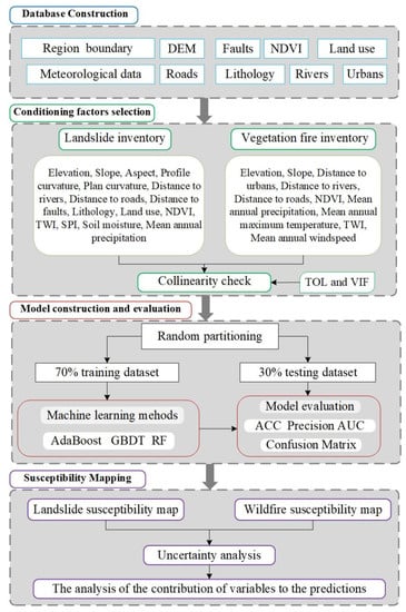 Flow chart of the landslide and wildfire susceptibility modeling and mapping in this paper.