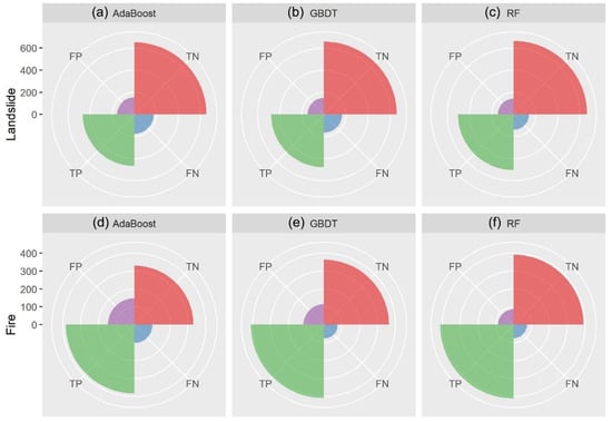 The results demonstrated that RF exhibited the best performance among the three ensemble machine learning methods for the two hazards, determining that the RF model is more predictive than GBDT and AdaBoost in landslide and wildfire susceptibility modeling and mapping. The results of the contingency plot of the confusion matrix statistics confirmed that RF is the best model among the three machine learning models (Figure 4). RF performed better in wildfires than in landslides. The gap in the performances between landslides and wildfires may be induced by the difference in data quality. The RF model exhibited good generalization capability. In addition, Figure 4 shows the specific percentages of TN, TP, FN and FP, giving a more detailed accuracy evaluation. FP refers to the nonhazard locations that are wrongly predicted as the hazard, while FN is the hazard locations that are wrongly predicted as nonhazard. TP and TN are the samples that are correctly predicted. In Figure 4, the TN and TP account for large portions in all the models in landslides and wildfires, while the mispredicted samples (FP and FN) in landslides and wildfires account for smaller parts. RF have the least FN and FP, demonstrating the high accuracy of the RF model.