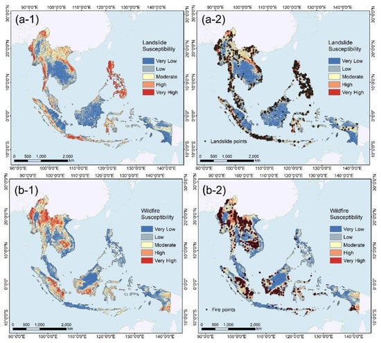 The susceptibility maps show a fairly good spatial distribution of the high susceptible areas. Most of the hazard points are within the areas with very high susceptibility, indicating the reliability of the susceptibility maps. The landslide susceptibility is high in the Philippines, the west of Myanmar, the middle of Vietnam and Lao and the southwestern parts of Indonesia near the Indian Ocean. Wildfires need dry environmental conditions. The wildfires in the Philippines are relatively low. The wildfires in Myanmar are relatively severe and are also serious in the northern area of Lao. Cambodia also has high wildfire susceptibility. Additionally, the wildfire susceptibilities in Sumatra and Borneo of Indonesia are relatively high.