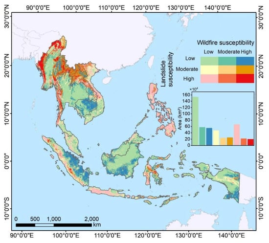 As previously reported, the susceptibility maps were divided into five classes. Here, we carried out an aggregation to make the intersection map clear and distinguishable—namely, the low class includes low and very low, while the high contains high and very high. Subsequently, an intersection operation between the landslide and wildfire susceptibility maps was performed. A multihazard susceptible map (Figure 6) combing landslides and wildfires was derived by the interaction between the three integrating classes of the susceptibility of landslides and wildfires. The resulting maps showed the classification scheme of low, moderate and high susceptible areas between landslides and wildfires. The majority of the regions have low susceptibility in both landsides and wildfires. The Philippines is highly susceptible to landslides but not very susceptible to wildfires. The western part of Myanmar showed a high susceptibility to both landslides and wildfires. Landslide susceptibility is high in the Philippines, the middle of Vietnam and the southern costal of Indonesia, while the wildfire susceptibility is low. Those regions in the middle and east parts of Indonesia and northwestern Cambodia show a high susceptibility to wildfires but a low susceptibility to landslides. The west of Myanmar is highly susceptible to both wildfires and landslides. From the bar chart, which summarizes the areas of different combination classes, it can be seen that the areas with low susceptibility in both hazards account for the majority, followed by areas with high landslide susceptibility and low wildfire susceptibility, and areas where both of the hazard susceptibilities are high make up the least proportion, confirming the statistical analyses on the maps.