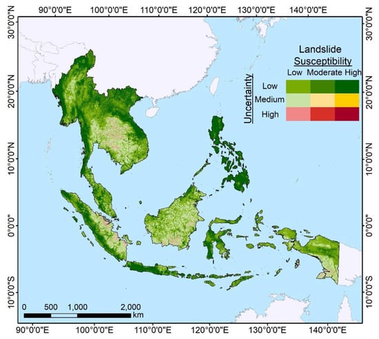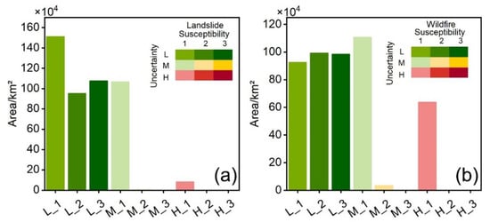 In general, the uncertainty maps gave more powerful support to evaluate the landslide- and wildfire-susceptible regions of SEA, along with the susceptibility maps. Figure 9 represents the areas for each combination class. Landslide and wildfire uncertainty maps have similar characteristics. The low uncertainty level was the majority in both landslides and wildfires, while there were more pixels with high uncertainty in the low susceptibility class of wildfires. In landslides, the low susceptibility with low uncertainty accounted for the most, while, in wildfires, the low susceptibility with medium uncertainty was the largest. Although landslides and wildfires both have good reliability in the highly susceptible areas, the landslide susceptibility map was more reliable than that of wildfires in the low susceptibility class.
