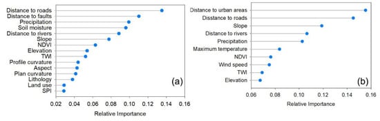 The relative importance of the conditioning factors ((a) landslides and (b) wildfires).