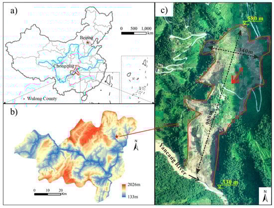 The Zhongbao landslide (29°28′53″ N and 107°55′43″ E) is located on the north side of the Yancang River in the Zhongtai Group of Liujing Village, Tudi Township, Wulong County, Chongqing City (China), about 136 km from the city center (Figure 1). The study area extends to the subtropical humid monsoon zone and features a mild climate with abundant sunshine and mean annual precipitation of 1000–1200 mm, mainly concentrated from April to July. The landslide has a maximum length and width of 900 m and 340 m, respectively, covering a total area of approximately 26 × 104 m2 with an estimated volume of 130 × 104 m3. The landslide is located in the Qinggang syncline, without any regional or small faults. The slope angle of the landslide ranges from 20°–40°, and a locally steep section can exceed 50°. The landslide mass was mainly composed of cataclastic rock mass and Quaternary deposits, including silty clay and rubble soil, overlaying the bedrock consisting of Silurian Lower Hanjiadian Formation (S1h) shale.