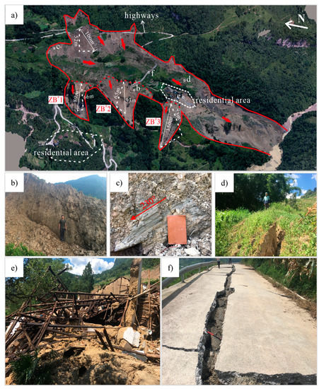 Hazard-bearing body and macroscopic deformations of the Zhongbao landslide. (a) Plane map of the Zhongbao landslide. (b) Silty clay and rubble at the scarp. (c) Scratches at 230° on the trailing edge of the landslide. (d) The slope in the middle of the landslide was compressed to the point of bulging. (e) Destroyed houses. (f) Cracks on a road.