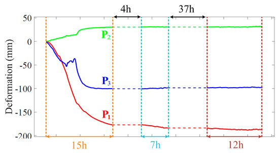 Based on the differential interferometry technique, GB-InSAR images were processed together. Figure 6 shows the cumulative deformation map. Three regions with large deformations can be observed, where negative deformation indicates that the direction is toward the radar. Figure 7 shows the deformation curves of three typical points during three monitoring periods.