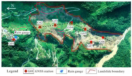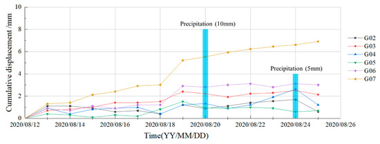 According to villagers’ accounts, the first macroscopic surface deformation appeared on the trailing edge, and huge bulging cracks on the middle landslide were found in the field investigation (Figure 2d). Therefore, it can be safely inferred that the energy that started the Zhongbao landslide was located at the trailing edge, which is the feature of the thrust load that caused the landslide. During the emergency monitoring period, although there was local movement at the center, it did not pull the rear part, so the landslide was presumed to be stable overall. Despite this inference, seven GNSS stations and one rain gauge were installed in the next few days to control the landslide risk. As shown in Figure 9, the rain gauge and G01 were installed in the residential area outside the landslide, and the remaining G02–G07 points were distributed on the landslide body. There was almost no displacement change at G01, which suggested that the landslide would not affect the residential area outside the boundary. The deformation time series of G02–G07 can be seen in Figure 10. The cumulative displacement of the landslide over a month was less than 3 mm, except for G07. The rain gauge detected 10 mm and 5 mm rainfall on August 20 and August 24, but the displacement time series did not register it. Slope failure is the process of internal stress release, and the landslide is currently stabilizing after the past failure.
