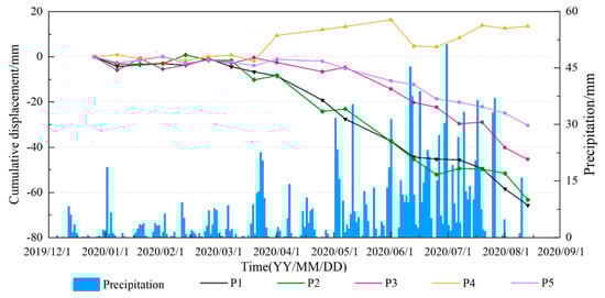 Before the landslide event, there were no rain gauges to obtain accurate rainfall data at the local landslide area. Figure 13 shows the average rainfall of Wulong District (monitored by the local meteorological station in Wulong District) and roughly represents the 6-month precipitation trend in the landslide area. Figure 13 reveals that the intensified deformation of typical points started with the persistent rainfall in March. Thereafter, the cumulative displacement increased linearly under the influence of continuous heavy rain from May to July. Since two images of the series were captured after the landslide (July 25), the curve should show significant acceleration and deceleration around the event, according to the literature and practical monitoring. However, the deformation time series of typical points registered by Sentinel-1 does not show such characteristics. It is difficult to confirm the status of landslide stability and make an early warning decision on the basis of cumulative displacement without any acceleration indicators.