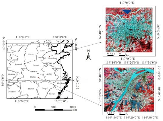 In this study, we selected two Chinese provincial capital cities, Jinan and Wuhan, as the study areas. Figure 1 shows the false-color images generated from Landsat 8 data of the study areas.