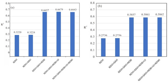 R2 statistics of establishing regression relationship with different combination of indices. (a) and (b) are the R2 statistics of Jinan (11 July 2014) and Wuhan (24 July 2016), respectively.