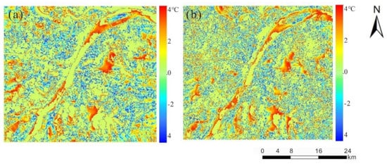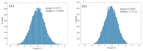 Figure 7 shows the histogram of the error image, and Figure 7a,b correspond to Figure 6a,b. The number of pixels in the interval of [−1,1] in Figure 7a is higher than that in Figure 7b. We selected the mean value and standard deviation (StdDev) as evaluation indicators. The mean value was calculated based on all pixels and is preferably as close to 0 as possible, which indicates unbiased prediction. By comparing Figure 7a,b, we found that the mean values are 0.1271 and −0.2289 °C and the StdDev values are 1.6390 and 1.7131, respectively. So, the mean value of Figure 7a is closer to 0, and the StdDev of Figure 7a is smaller than (b), which means that the dispersion is also smaller.