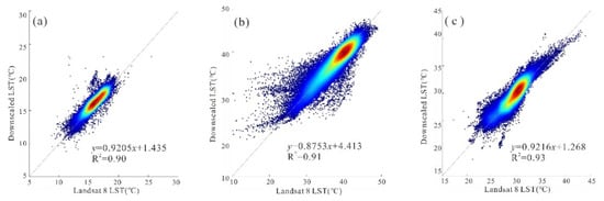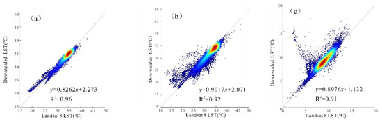 Density scatter plots between the reference Landsat 8 LST and the downscaling LST with a spatial resolution of 100 m in Wuhan: (a) 23 January 2014; (b) 24 July 2015; (c) 30 October 2017.