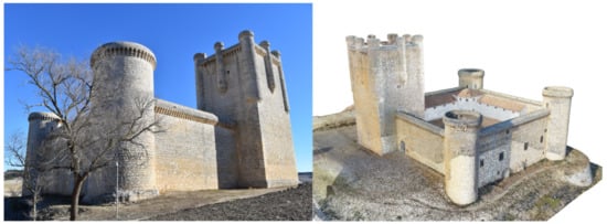 The 3D point cloud of the Castle of Torrelobatón (local coordinates) was taken combining photogrammetric 3D reconstruction and 3D laser scanning. The first technique was aided by a drone DJI Inspire (X3 camera-12 MPx SONY optics) following a helical flying path to acquire the entire envelope (318 full-frame pictures from the ground to a maximum height of 52 m, 80% overlapping). The drone is equipped with a GPS and a 6-axis Inertial Measurement Unit (IMU) that grants the drone hovering and positioning during image acquisition, according to mathematical principles presented in Hosseinyalamdary et al. [21]. A ground-based LIDAR is used instead of an onboard one so that further corrections such as those proposed by Zhang et al. [22] or Wang et al. [23] are not required. Lens calibration is ensured by following the maker’s procedure at the very first time the drone is used and at specific service intervals. In-flight, the arms lift to provide the camera with an unobstructed view. A 3-axis gimbal keeps shots steady, and the camera is pointed in the same direction as the quadcopter banks and turns while keeping a self-calibration procedure.