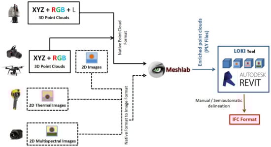 The resulting enriched 2D/3D point clouds could be saved as many PLY files as mapped images to be managed into REVIT using a custom-made plug-in called the “LOKI tool”. Figure 2 describes the process. The LOKI plug-in is programmed in C++ and supported by the Point Cloud Library (PCL) as a standalone, large-scale, open software project for image and point cloud processing. Although this plug-in was originally created for REVIT 2018, it is continuously demanding updates to the evolving versions hand in hand with the surveying and imaging techniques. The LOKI installation pack, including step-by-step instructions, is released as Supplementary Materials to this publication.