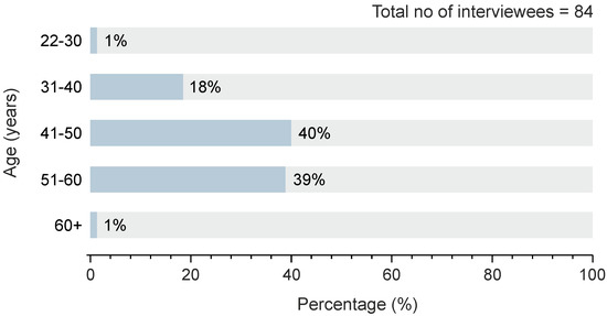 In terms of age for the whole sample, only one (1) participant was under the age of 30 (1%) and one (1) over the age of 60 (1%). For the decades in between, 34 participants were between 41 and 50 years old (40%), 33 participants were between 51 and 60 years old (39%), and 15 participants were between 31 and 40 years old (18%) (see also Figure 1).