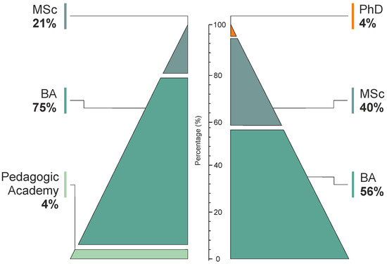 Up until 1984, prospective teachers of primary education were trained only in the Pedagogic Academies, public institutions, which offered a 2-year lower-level higher education qualification. As of 1984, prospective primary school teachers could receive a bachelor’s degree by the newly established Pedagogical Departments for primary education in Greece’s public universities. The two systems co-existed until 1988, when the Pedagogic Academies were abolished. Consequently, from 1989 onwards, there have been two pools of primary teachers eligible for recruitment [65]. During the subsequent years, the state offered in-service primary school teachers, holding a Pedagogic Academy diploma, the opportunity to upgrade them to four-year university level degrees, by implementing country-wide, in-service teacher equalization program, called the Exomiosi program, between the years 1997 and s1999 [66]. In our study, it is worth mentioning that 23 out of 25 teachers holding a Pedagogic Academy diploma had completed an Exomiosi program and, therefore, upgraded their degree.