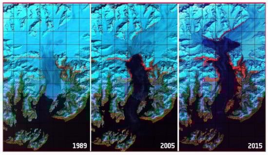 Satellite diachronic imagery of the Columbia glacier in Alaska. The image sequence was shown to the teachers to demonstrate the use of remote sensing for the calculation of the glacier’s shrinkage during a period of 26 years (taken from the ESA student activity “The ice is melting”, which is part of the “Teach with space” collection for the primary school level).