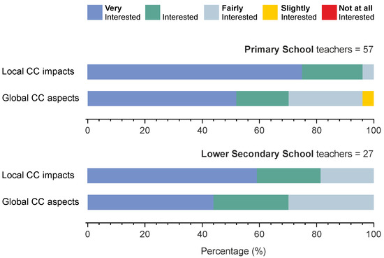 As such, we formed a question on the preferred didactic approach for climate change i.e., either from its global–planetary cause-and-effect perspective, or from the perspective of local impacts, in the form of intense and more frequent natural disasters. Participants were asked to rate their level of interest by means of a five-point Likert scale. As established by the teachers’ ratings, local climate change impacts attracted most of the participants’ interest. Specifically, 70% of teachers were “Very interested” and 21% were “Interested” while the remaining 8% were “Fairly interested” in local extreme events. Global climate change impacts and causes also attracted the interest of participants, but to a lesser extent: 50% of teachers were “Very interested”, 20% were “Interested”, 27% were “Fairly interested”, and 2% were “Slightly interested”.