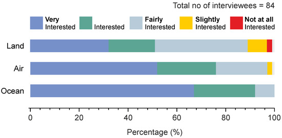 Participants were asked to rate their level of interest on the defined thematics by means of a five-point Likert scale. As established by the educators’ ratings (see also Figure 6), for land visualizations, 32% of teachers were “Very interested”, 19% “Interested”, 38% were “Fairly interested”, 8% were “Slightly interested” and 2% “Not at all interested”. For Air, 52% of teachers were “Very interested”, 24% as “Interested”, 21% were “Fairly interested”, and 2% were “Slightly interested”. For Ocean, 67% of teachers were “Very interested”, 25% “Interested”, and 8% were “Fairly interested”.