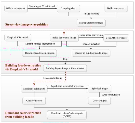 Figure 2 shows a flowchart to illustrate the extraction of the dominant color of the urban façade (DCUF) from the street view image at a location. This flowchart has three parts, including (1) Street-view imagery acquisition; (2) Building façade extraction via Deeplab V3+ model; (3) Dominant color extraction from building façade. Details of the implementation are explained in the following sections.