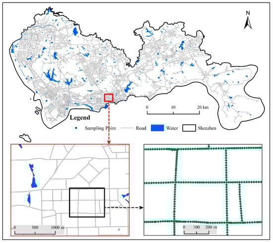 The BSV panoramas were automatically crawled based on the locations of the sampling points and the Baidu Map Application Programming Interface (API) service. OpenStreetMap (OSM) is a collaborative project to create and provide free geographic data. The road network in the study area was derived from OSM (https://www.openstreetmap.org/, accessed on 11 April 2021) with Python scripts. The sample locations were generated at intervals of 20 m. A total of 231,758 sample points were generated based on the simplified road network from OSM. Figure 3 presents the illustration of the sampling points on the road network, with a randomly selected area that has been magnified. The latitude and longitude coordinates of the sampling points were used as the major parameters for crawling the BSV panoramas via the Baidu Map API.