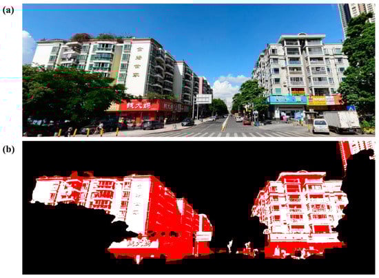 Figure 4 is an illustration of the urban façade extraction from the BSV panorama. The semantic image segmentation model divides the image into several segmentations (Figure 4b). The urban façade image is then extracted by using the segmented urban façade boundary to clip the street-view image (Figure 4c). To further improve the urban façade extraction results, both closing and erosion algorithms were adopted to refine the building’s edge by removing the fragmented areas [42].