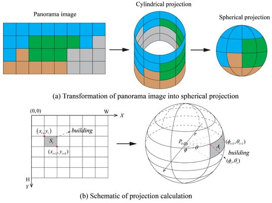 Then, each pixel area and solid angle in a spherical image can be calculated with the Equations (5) and (6) [19,44]: