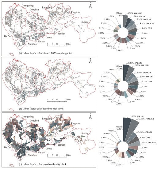 Overall, the urban façade color of Shenzhen is characterized by a gray tone with low chroma. As shown in Figure 8, the urban façade color with the largest proportion of each BSV sampling point is medium-gray (Munsell code: 10B 5.25/1), while that of each street and city block is a dark-gray color (Munsell code: 5PB 3.5/1). Such light and cool colors of urban façades are in harmony with the natural environment of the coastal city. In Nanshan, Futian, Luohu, and Yantian District, the urban façade color is medium-gray, dark-gray, and blue–gray, respectively, because vast commercial buildings with substantial curtain walls of glass exist in these areas, leading to a cool color palette. The urban façade color is more diverse in other districts, such as Dapeng, Guangming, and Pingshan District. The urban façade colors here are light-gray, brown–gray, and some light and warm colors in residential areas, such as brown, light yellow, and cream-colored.